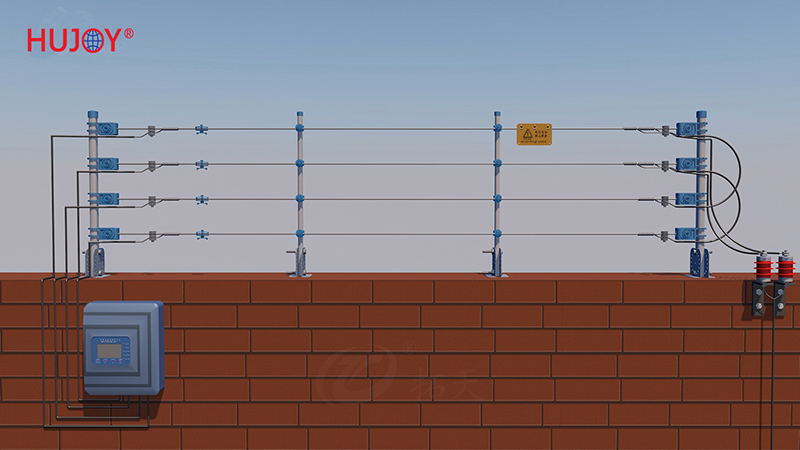 3、现前端围栏上每根线每个点都有5000V-10000V高压脉冲电,让入侵者无机可乘